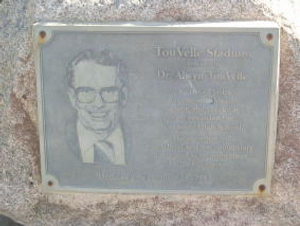 Named in honor after Dr. Alwyn TouVelle, a memorial on the walkway leading into the stadium describes Dr. TouVelle as a man "...who for 25 years gave unselfishly his time and energy as team physician for Bettendorf High School. His devotion to our school and community has served as an inspiration for all to emulate" and was dedicated on September 18, 1981.
